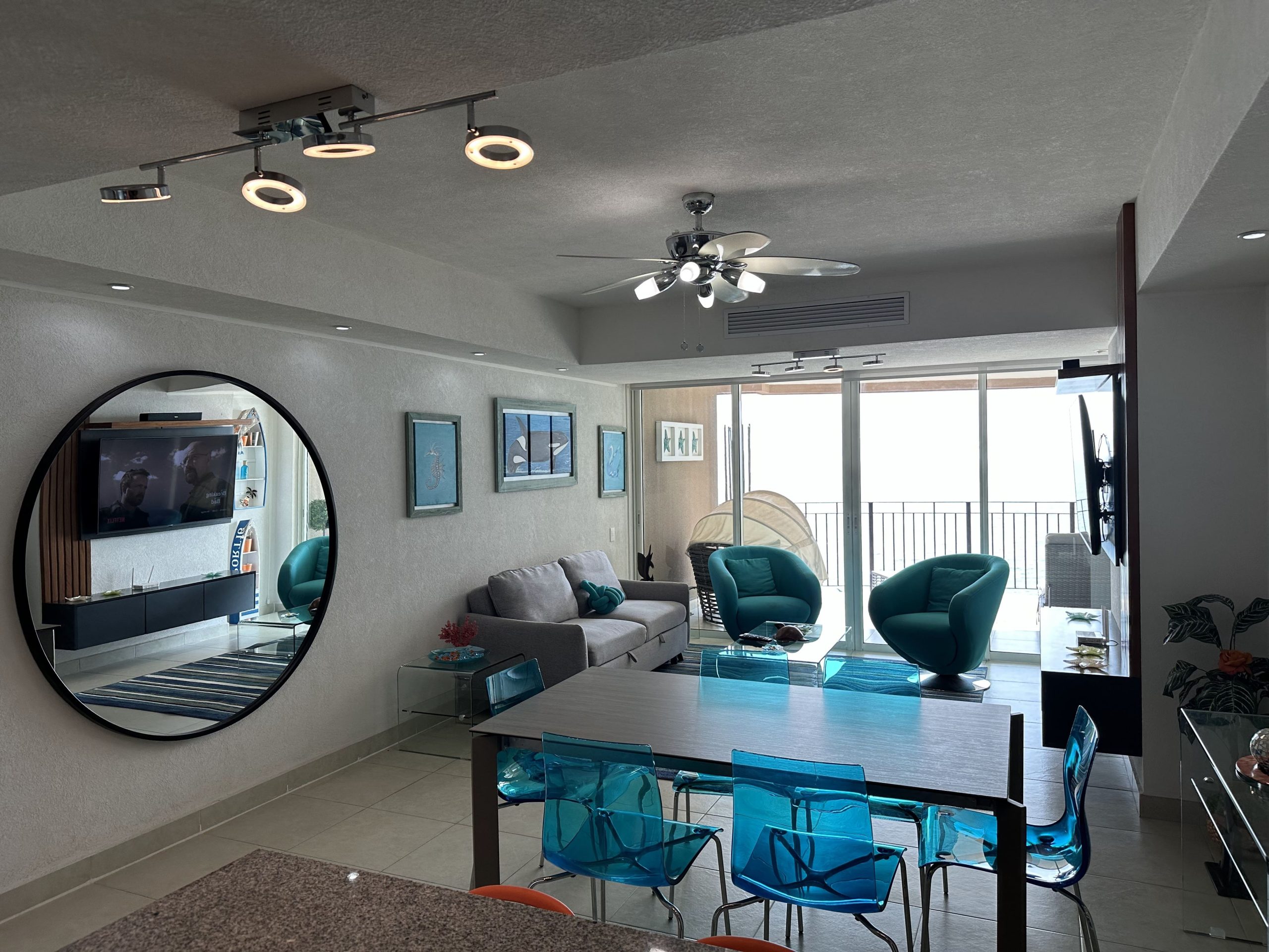 •Balcony: Enjoy the view from the balcony, which includes a barbecue grill, lounge chair, and a sofa for relaxing and taking in the fresh air.